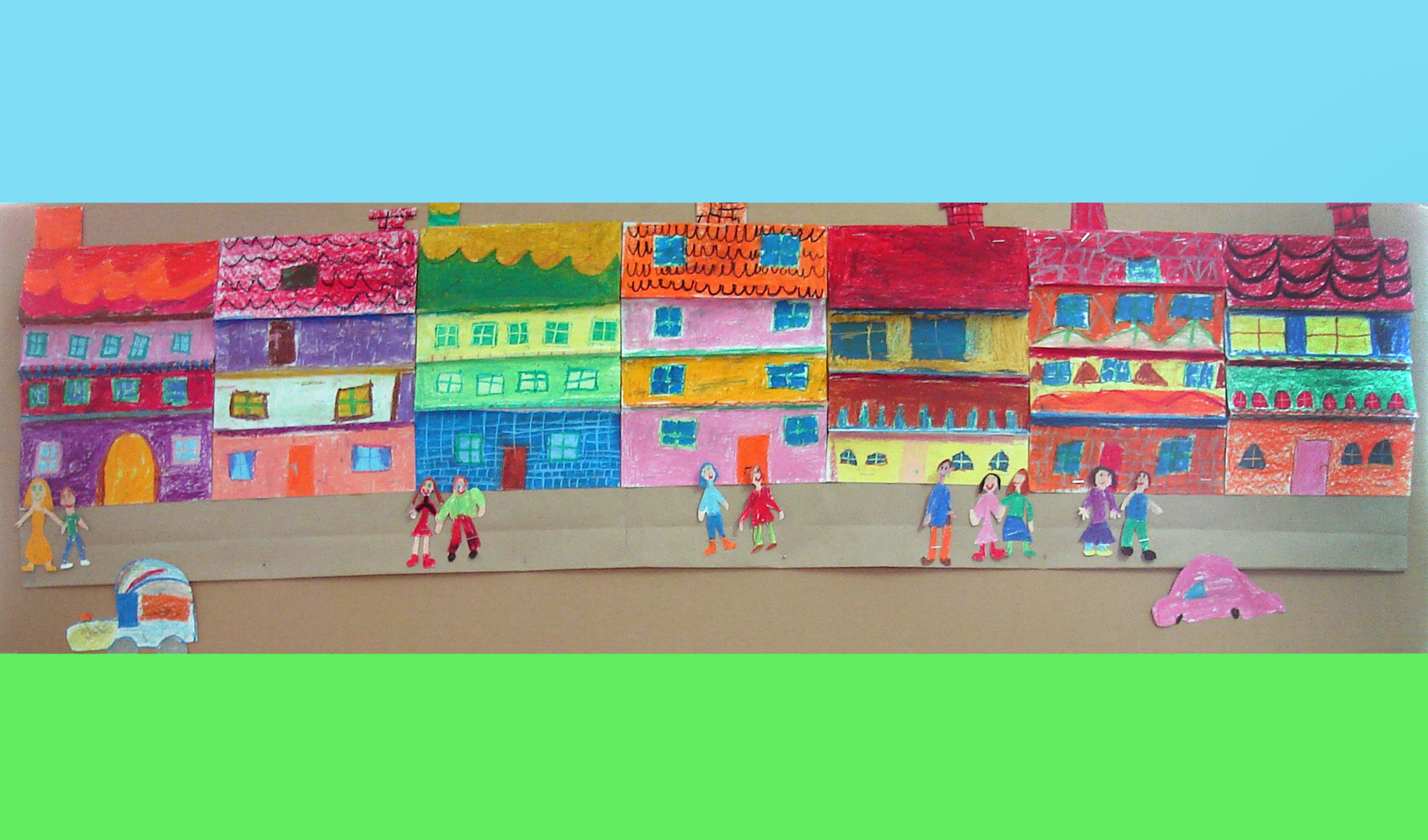 Podzielone płaszczyzny kartki zamalowujemy wedle naszej fantazji. Na parterze mogą znaleźć się sklepy, kawiarnie, ogródek, wyżej balkony, okna z zasłonkami, na dachu kominy itd.